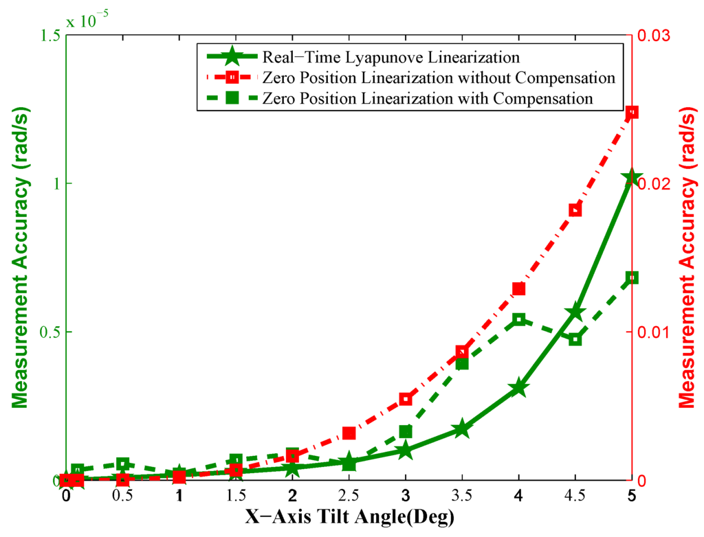 Comparing Figure 6 to Figure 7, the foregoing analysis for static measurement can be validated; the most important and useful information is given: zero tilt angle linearization Equation (28) with the regular error compensation components is the best choice for the time-sharing multiplexing scheme of GW.