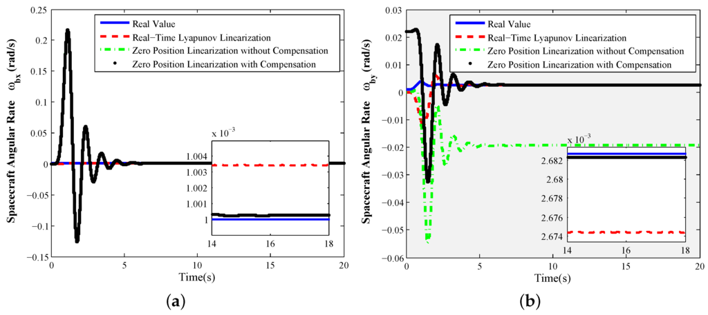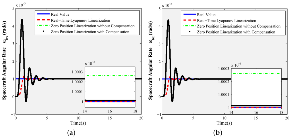 Especially, the response curves of the X-axis tilt control commands given by ° and ° are shown as Figure 6 and Figure 7, respectively. From Figure 6, when the rotor is working at the tilt angle of °, the measurement accuracy of the zero position linearization Equations (28) with compensation terms () is improved to precede rad/s compared to the ones without any compensation term. At this point, the real-time Lyapunov linearization measurement can also achieve the perfect measurement performance of the spacecraft angular rates. When the tilt angle of the rotor is increased to ° in Figure 7, the measurement errors of the zero position linearization Equation (28) with compensation terms () are far less than rad/s. The real-time Lyapunov linearization measurement accuracy can arrive at rad/s. However, the measurement accuracy of the zero position linearization Equation (28) without any compensation term deteriorates seriously, so that the uncompensated zero position linearization equations are not suitable for the angular rate sensing at the large tilt angle. However, since the motor spin angle sensor needs to be introduced to realize the measurement of the motor spin angle when the real-time Lyapunov linearization measurement equations are used to realize the angular rate sensing, it will make the measurement realization more complex in the time-sharing multiplexing scheme.