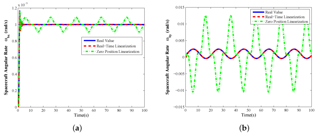 - Compared to Equation (20), the forms of linearization Equation (28) at zero tilt angles are obviously more concise. More importantly, after ignoring the twice periodic components in Equation (27), there exist no terms about motor rotation angle in Equation (28), which means that it is more convenient for the spacecraft angular rate sensing, since the special sensor for measuring the motor rotation angle in real time is no longer needed in this kind of situation.