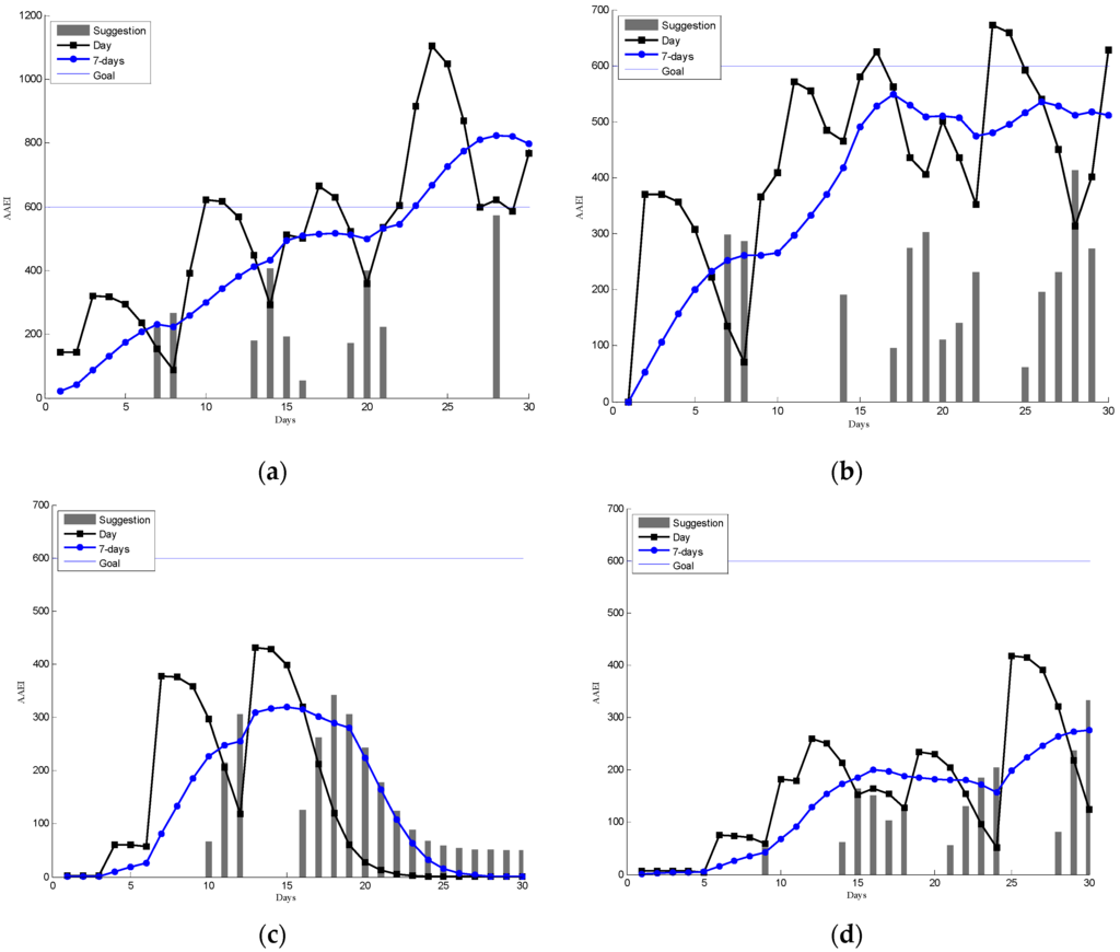 Predictive seven days average AAEI is the average of six known AAEI from today to five days ago and one predictive AAEI. Based on the Equations (1) and (8), the predictive seven days average AAEI, , becomes: