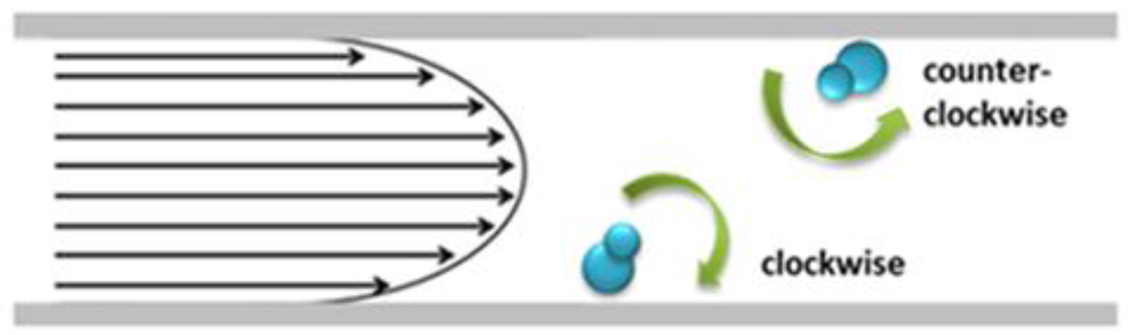 The cartoon explains the rotation effect induced by the parabolic velocity profile, when objects are close to the channel walls.