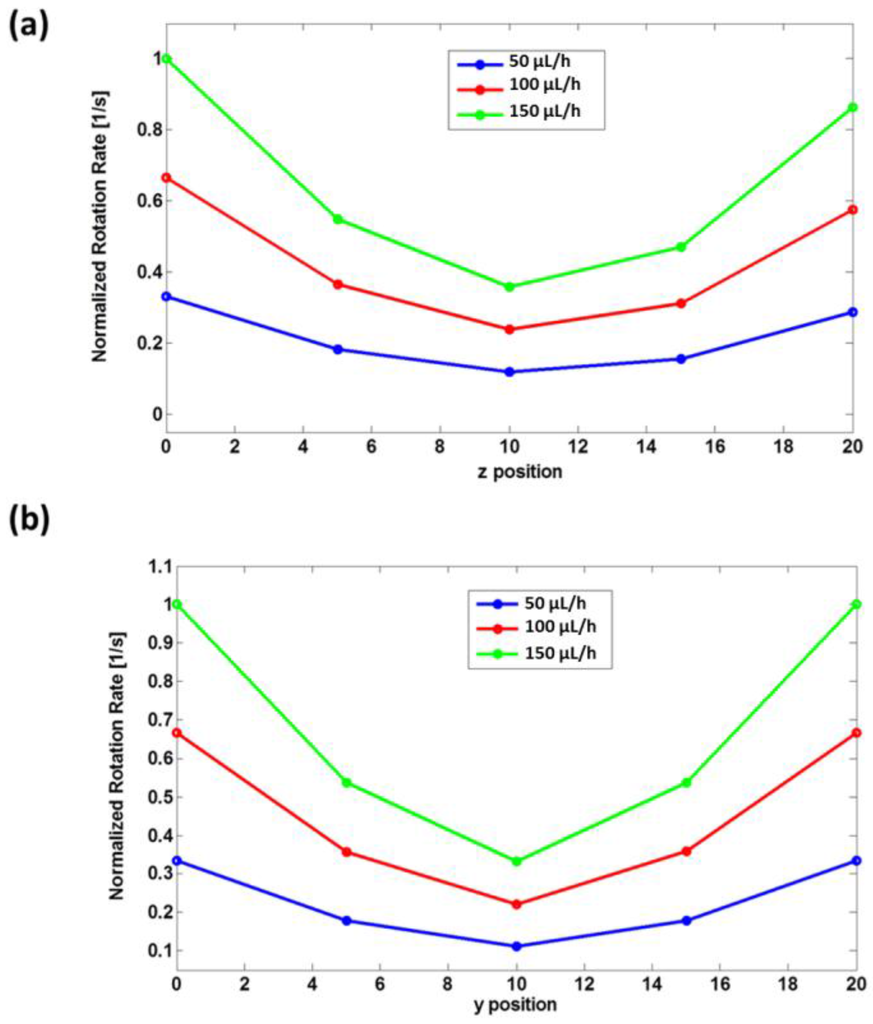 Numerical simulation results. The rotation rate (number of rotation/s) as a function of (a) the y horizontal position and (b) the vertical position across the channel. Three studies were performed by setting different values for the flow-rate of the fluid at the inlet.