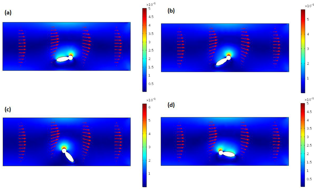 Then, a similar approach was used in order to simulate the operation of the out-of-plane rotator. In this case the target object was placed at five different positions along the z direction, with the y position fixed. Water, as defined in the COMSOL Multiphysics library, was set as the bulk material. The flow rate was set to 50, 100, and 150 μL/h. The results are reported in Figure 3a for the in-plane and Figure 3b for the out-of-plane rotator. The data are normalized to the maximum value of the rotation rate. The two graphs show that the rotation rate reaches the minimum value when the target object occupies a position close to the center of the channel. In addition, a 2D numerical analysis has been performed in order to analyze the rotation effect when the object occupies different angular position respect to the fluid flow direction. The simulation has been done by placing the asymmetrical object in a channel with a width of 30 µm. Then, the rotation rate (number of rotation per second) was calculated by changing the orientation of the ellipse from 0° (ellipse with the major axes parallel to the direction of the fluid) to 170°, with a step of 10° (see Figure 4). The rotation rate resulted to be higher when the ellipse is in a vertical position, when the major axis is perpendicular to the fluid flow, and it gets lower when it is in a 0° position. This is what we expected, since when the ellipse is in a vertical position the two opposite sides will experience a much higher velocity gradient. These data are shown in the graph in Figure 5, where the values for the rotation rate are plotted as function of the angular orientation.