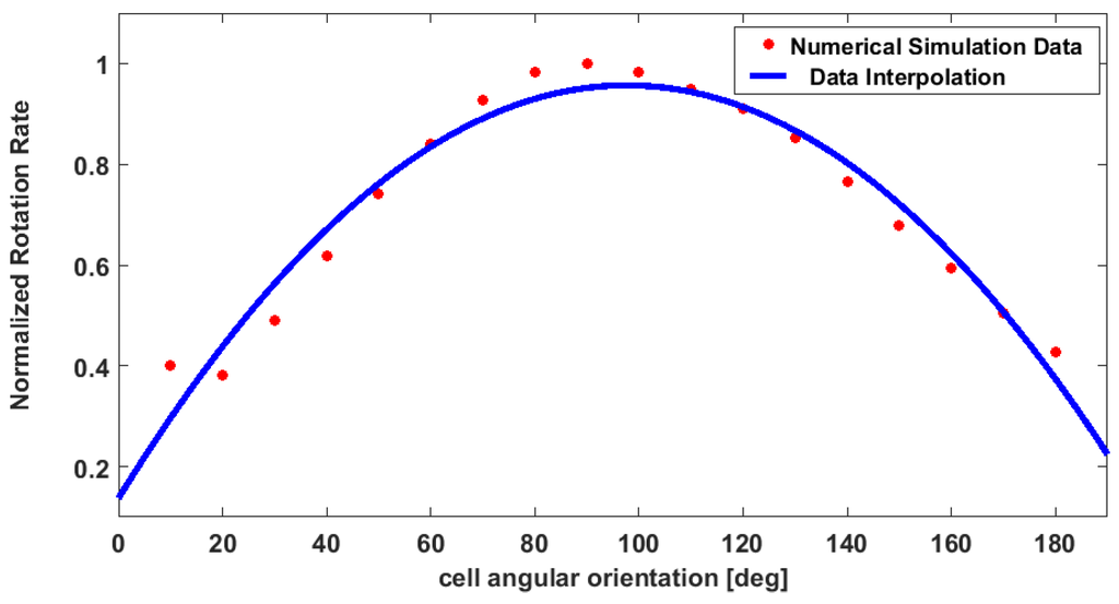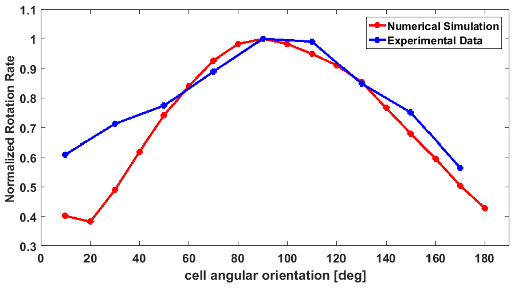 The graph in Figure 9 reports the rotation rate as a function of the cell angular orientation. The experimental data are compared with the data obtained from the numerical simulations (see Figure 5). As we expected, when a cell occupies a position at 60°–140° respect to the fluid direction, the rotation rate reaches the highest values. This can be explained by considering that if the cell is in a vertical position, the cell surface will experience a higher velocity gradient. For the opposite reason, the angular velocity decreases when the cells occupy a horizontal position, which is the situation when a cell angular orientation is close to 0° and 180°). Therefore, the trend of the curve experimentally obtained is in agreement with the one obtained by COMSOL. However, it is evident that a main difference between the two curves exists: the experimental results show a higher rotation rate when the angular orientation gets close to 0°/180°. This behavior can be explained considering that numerical analysis simulates an ideal condition. Indeed, the flow rate is kept constant, without considering any variation. In experimental condition, small variations of the flow rate can accidently occur. In addition, in our model we are not taking into consideration the interaction between the object and fluid, and the object and the channel wall.