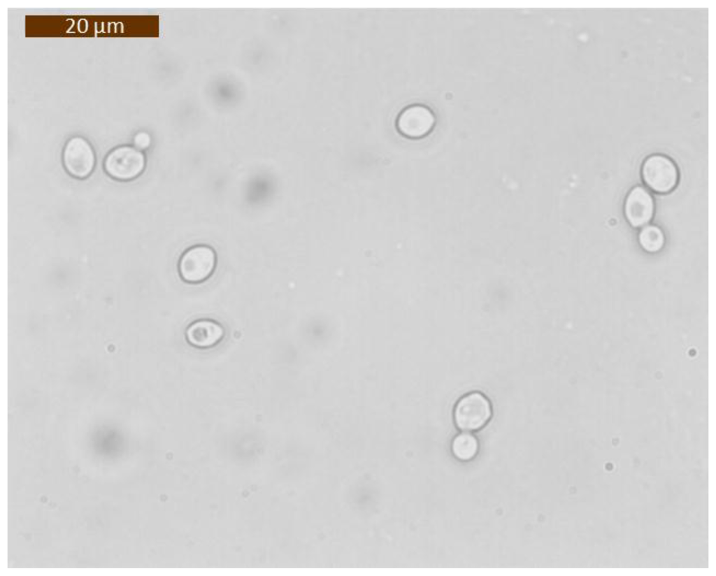 Microscopy image of the Saccharomyces cerevisiae cells used for the experimental testing of the microfluidic devices.