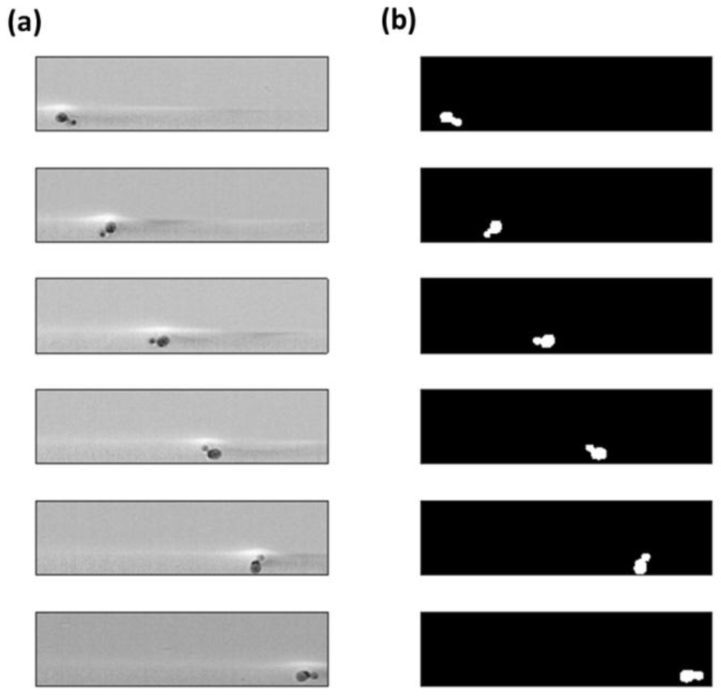 In-plane rotation device: (a) In the six consecutive frames, a cell close to the channel wall is induced in rotation; (b) The same frames are converted in binary images.