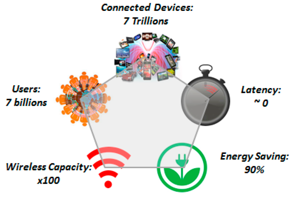 The next generation 5G wireless communications are currently being developed [1,2]. Indeed, the first deployments of a 5G network are expected to be fully operating in 2020 [3]. The design goals of such systems are shown in Figure 1. These systems are conceived to provide very high data rates (typically Gbps), extremely low latency, manifold increase in base station capacity and significant improvement in users’ perceived quality of service (QoS), compared to current 4G LTE networks [4]. There are many innovative technologies that will be used to satisfy the demands of the massive volume of traffic and various devices: massive MIMO, orthogonal frequency-division multiple access (OFDMA), cloud radio access network (CRAN), software-defined networking (SDN), composite wireless infrastructures, flexible spectrum management, small cells, and heterogeneous network deployment, among others [5].