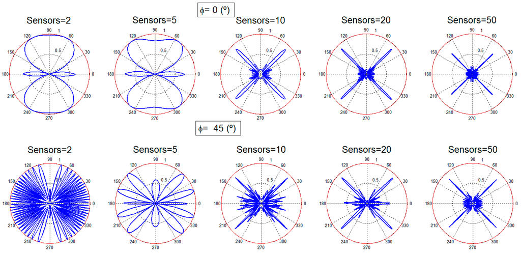 Figure 2 provides the beamforming results for two, five, 10, 20, and 50 sensors with isotropic antennas for the two different angular configurations. It is observed that although the desired direction is always obtained, for a low number of sensors there is still a high amount of radiated power towards other directions. This limitation is logical regarding the reduced number of sensors considered. As the number of nodes is increased, the radiated power towards directions different from the desired one is reduced, as it is clearly identified in Figure 2. In the case of using a dipole (Figure 3), the dipole radiation pattern adds a limitation in the beam that points towards the desired direction. The final beam is, thus, affected by the radiation pattern of the dipole, reducing the global gain achieved, as expected. When the number of nodes is high (20 and 50 nodes), the desired beam becomes more directive, the number of the rest of the beams, and also their gain, is reduced.