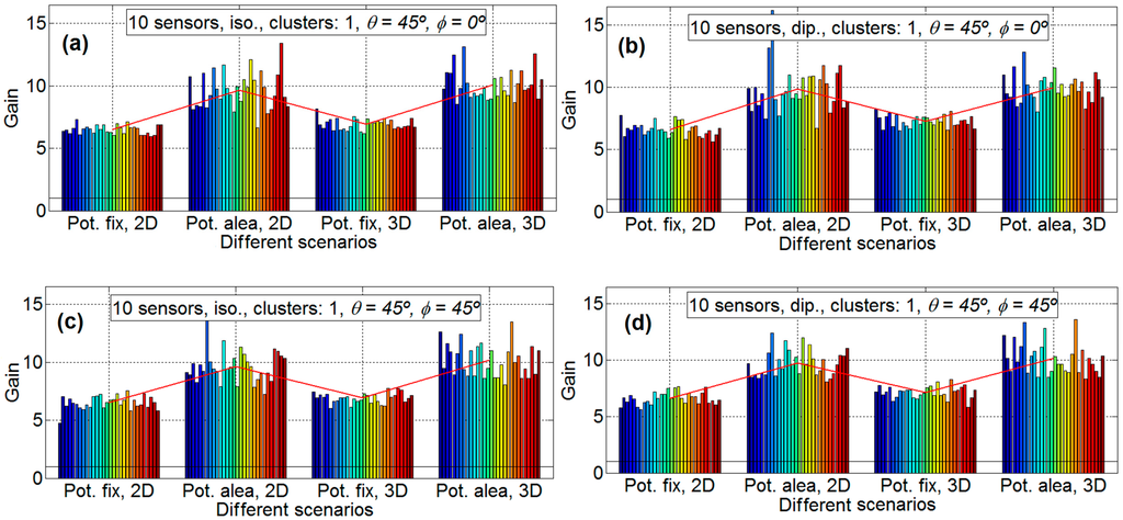 Gain results for 10 sensors. Isotropic ideal antenna, φ = 0° and θ = 45° in subfigure (a) (upper left), dipole antenna, φ = 0° and θ = 45° in subfigure (b) (upper right), isotropic ideal antenna, φ = 45° and θ = 45° in subfigure (c) (lower left) and dipole antenna, φ = 45° and θ = 45° in subfigure (d) (lower right).