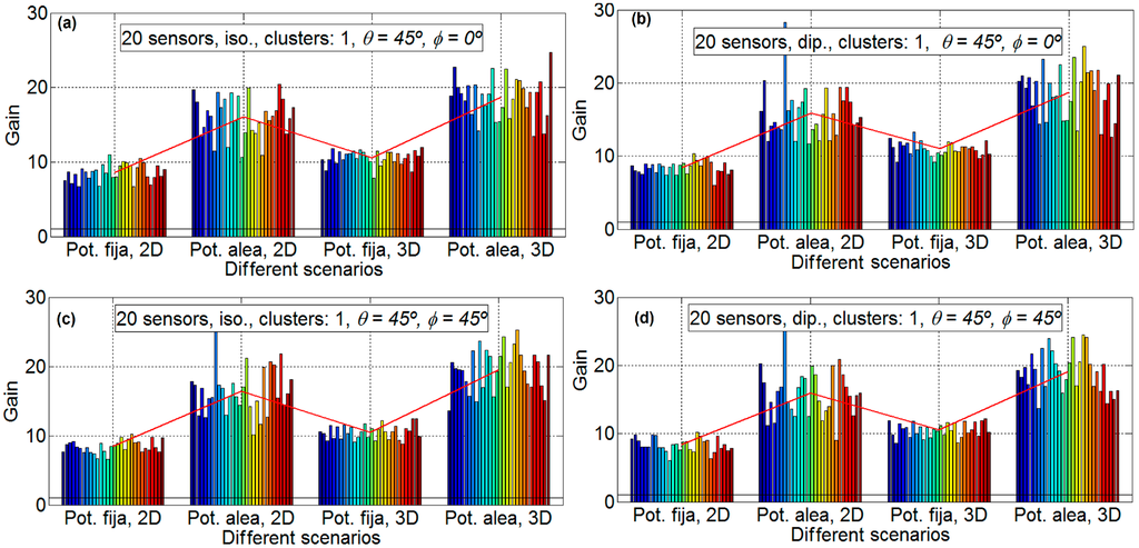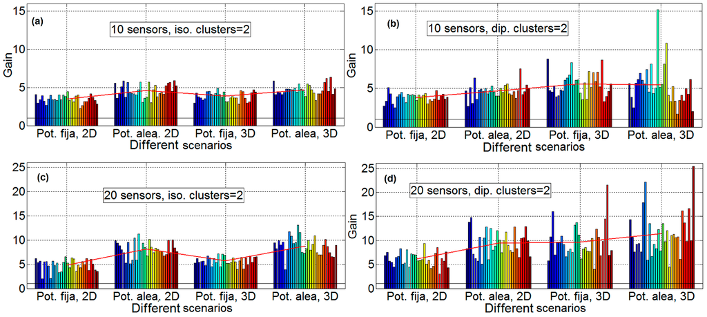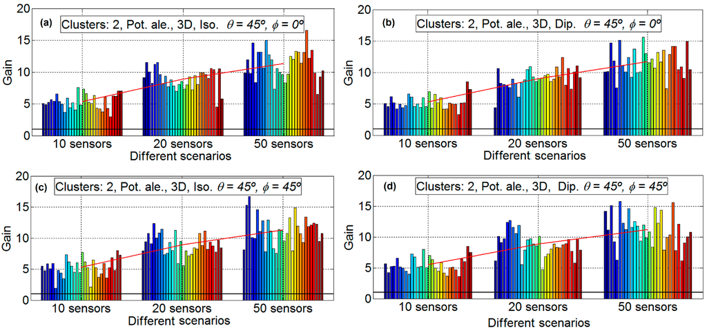 In this section, the sensor network has been divided into two clusters to study the behavior of the sensor network when the number of sensors is high. To split into two clusters of sensors, we have used the method of k-means, which is one of the simplest and popular, as explained in [15]: “One of the most popular and simple clustering algorithms, K-means, was first published in 1955. In spite of the fact that K-means was proposed over 50 years ago and thousands of clustering algorithms have been published since then, K-means is still widely used”. The procedure is as follows: first the K-means algorithm is applied to all sensors, obtaining two clusters, then, the beamforming technique is applied to the two clusters. To maintain the computational costs, a unique genetic algorithm has been applied in order to optimize the two clusters simultaneously, so that only one genetic algorithm optimizes the phases and amplitudes of the two clusters. Obviously, it would be a better strategy to apply two different genetic algorithms, one to each of the clusters. Figure 9 shows the results of performing optimization with two clusters, where 10, 20, and 50 sensors are simulated. All of the subfigures are for the Scenario D. The subfigures have the following characteristics: isotropic ideal antenna, φ = 0° and θ = 45° in subfigure a (upper left), dipole antenna, φ = 0° and θ = 45° in subfigure b (upper right), isotropic ideal antenna, φ = 45° and θ = 45° in subfigure c (lower left) and dipole antenna, φ = 45° and θ = 45° in subfigure D (lower right). Figure 9 shows that the gain factor is reduced (50%) when 10 and 20 sensors are simulated. This result is coherent since two clusters with half of the elements are being combined. As it has been stated in previous sections, the gain for scenario D is approximately equal to the number of elements in the range of 0–20. It is observed that the variability of the results is much higher when considering two clusters than when considering just one. However, with 50 sensors the gain achieved is about 12, not reaching the expected gain of 20. This gain value is expected because, with two clusters with more than 20 sensors, the gain at each cluster must be equal to the number of sensors in the cluster. The same explanation as in the previous section holds here. More sensors enlarge the search space to be explored by the GA, whilst is configuration remains the same concerning the number of function evaluations performed (sampling size).