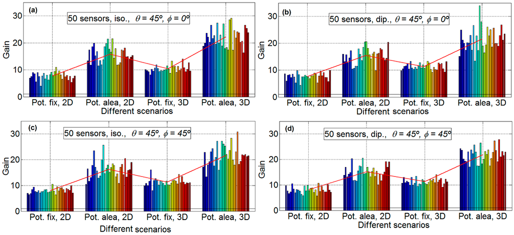 Gain results for 50 sensors. Isotropic ideal antenna, φ = 0° and θ = 45° in subfigure (a) (upper left), dipole antenna, φ = 0° and θ = 45° in subfigure (b) (upper right), isotropic ideal antenna, φ = 45° and θ = 45° in subfigure (c), (lower left) and dipole antenna, φ = 45° and θ = 45° in subfigure (d) (lower right).