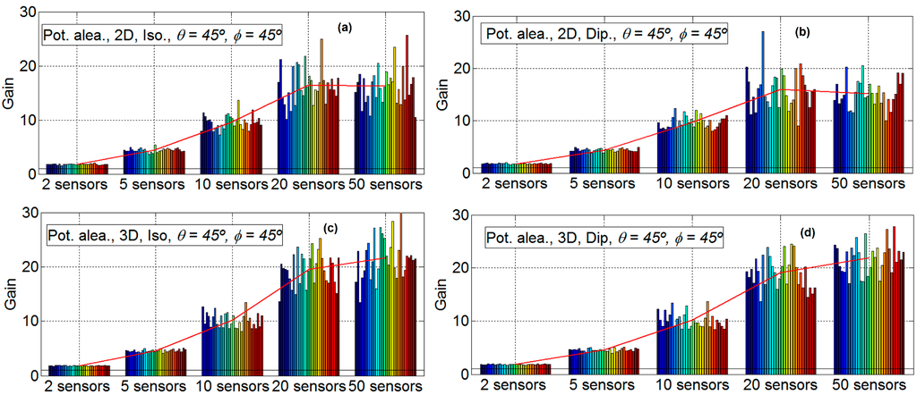 Figure 7 shows that, for the results considering two, five, 10, 20 and 50 nodes and 30 emulations for four scenarios (one scenario for each subfigure), the direction has little influence. Consequently, it is only shown for φ = 45° and θ = 45°. The subfigures have the following characteristics: isotropic ideal antenna and scenario B in Figure 7a (upper left), dipole antenna and scenario B in Figure 7b (upper right) and isotropic ideal antenna, scenario D in Figure 7c (lower left) and dipole antenna and scenario B in Figure 7d (lower right). Again, in all of the subfigures, the mean gain of each scenario is plotted with a red line. It is shown that the variability of the results increases with the number of sensors. With a low number of sensors (two and five) the standard deviation of results is low, and for a high number of sensors (20 and 50) the variability is very high. Additionally, in this figure, it is shown that the gain increase with the number of elements, except for 50 sensors. More details can be observed in Table 1 and Figure 8.