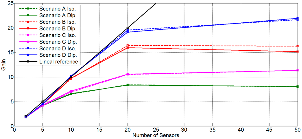 Table 1 shows the mean gain factor for all scenarios with two antenna and φ = 45° θ = 45°. Figure 8 shows the same data that is in Table 1 in a graphical mode. Moreover, a linear reference for visual performance it is added. In this figure it is possible to observe that, for a low number of sensors (two and five) all scenarios work well; the main gain factor is approximately equal to the number of sensors. For an intermediate number of sensors (10), only scenarios B and D obtain a mean gain factor near the number of sensors. Meanwhile, scenarios A and C lose more than 30% of the main gain factor with respect to Scenarios B and D. No great difference between 2D and 3D position is found. For 20 sensors, the unique scenario that has a mean gain factor similar to the number of sensors is scenario D. With 20 sensors there exist differences between all scenarios; 3D scenarios work better than 2D scenarios, and scenarios with sensors with random power have more possibilities to conform the beamforming than scenarios with sensors with fixed power. Finally, with 50 sensors, only 3D scenarios (C and D) increase the mean gain factor obtained with 20 sensors, and the increase is small and very far from the number of sensors.