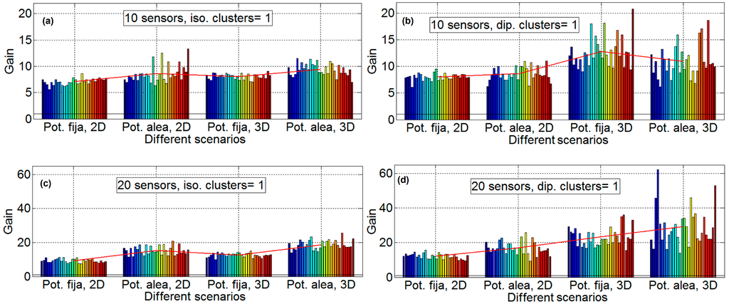 Gain results with one cluster, 10 and 20 sensors, all scenarios. Isotropic antenna and 10 sensors in subfigure (a) (upper left), dipole antenna and 10 sensors in subfigure (b) (upper right), isotropic antenna and 20 sensors in subfigure (c) (lower left), and dipole antenna and 20 sensors in subfigure (d) (lower right).