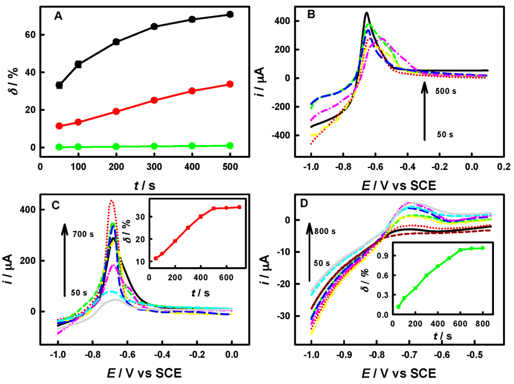 δ versus preconcentration-time curves (A, and Insets of C and D, n = 3) and anodic stripping LSV curves of the CdS QDs cast-coated on GCE (B, C and D, 100 mV·s−1) for our protocol (B), the similar protocol but without the beforehand exertion of a cathodic potential in air (C), and conventional solution-replacement protocol (D). Ten microliters of 10-fold diluted 6.5 mM CdS QDs dispersion was used for cast coating.