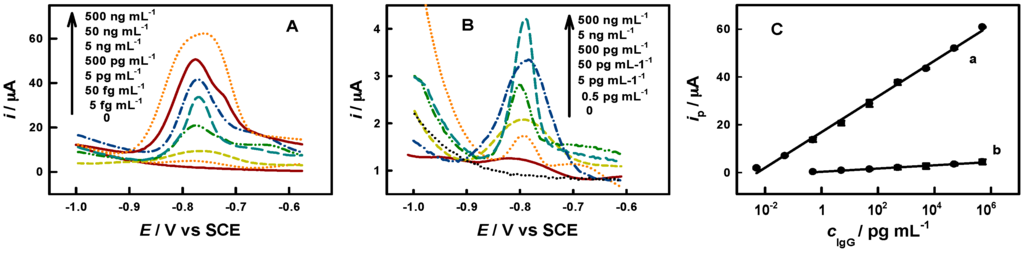 Differential pulse ASV curves for IgG immunoassay (A,B) and corresponding calibration curves (C, n = 3). Panel A and curve a in panel C are for our protocol. Panel B and curve b in panel C are for the conventional solution-replacement protocol.