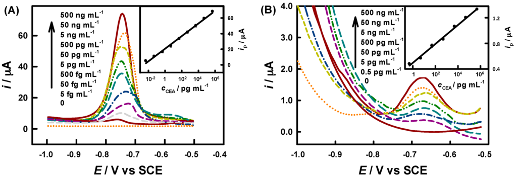 Differential pulse ASV curves for CEA immunoassay (A) for our protocol and (B) for the conventional protocol) and corresponding calibration curves (inset, n = 3).
