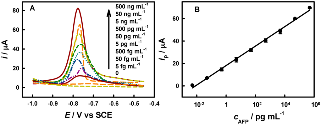 Differential pulse ASV curves for AFP immunoassay (A) and corresponding calibration curves (B) by our protocol (n = 3).