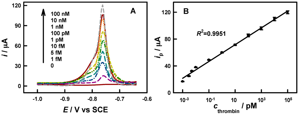 Differential pulse ASV curves for thrombin aptamer-electrodes (A) and corresponding calibration curves (B) using our protocol (n = 3).
