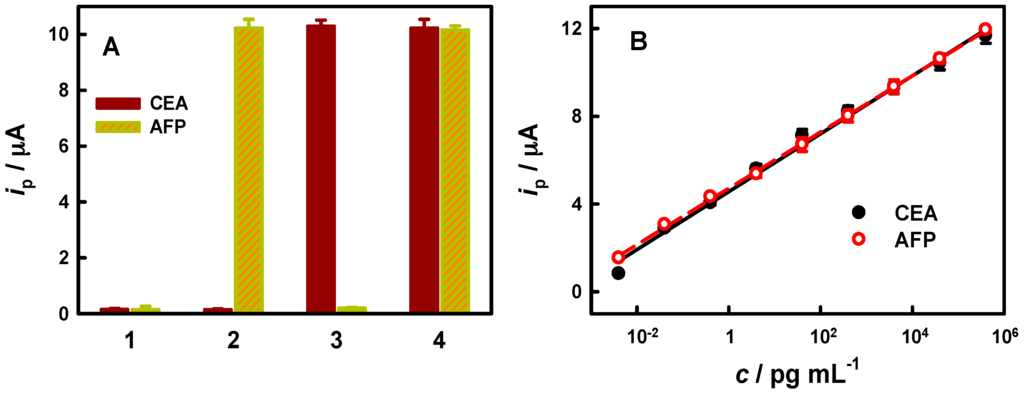 (A) Differential pulse ASV responses at a BSA/anti-CEA/SPCE and a neighboring BSA/anti-CEA/SPCE after incubated with blank control (1), 40 ng·mL−1 AFP (2), 40 ng·mL−1 CEA (3), 40 ng·mL−1 of AFP and CEA (4), and then Ab2-CdS QDs for immunoassay by our protocol; and (B) calibration curves for simultaneous analysis of CEA and AFP.