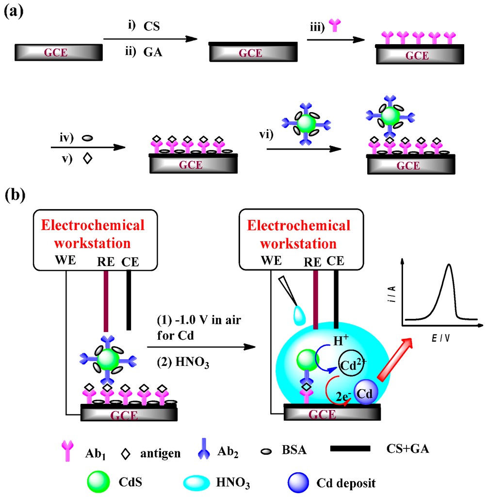 Steps for preparing the immunosensor (a) and outputting the ASV signal (b).