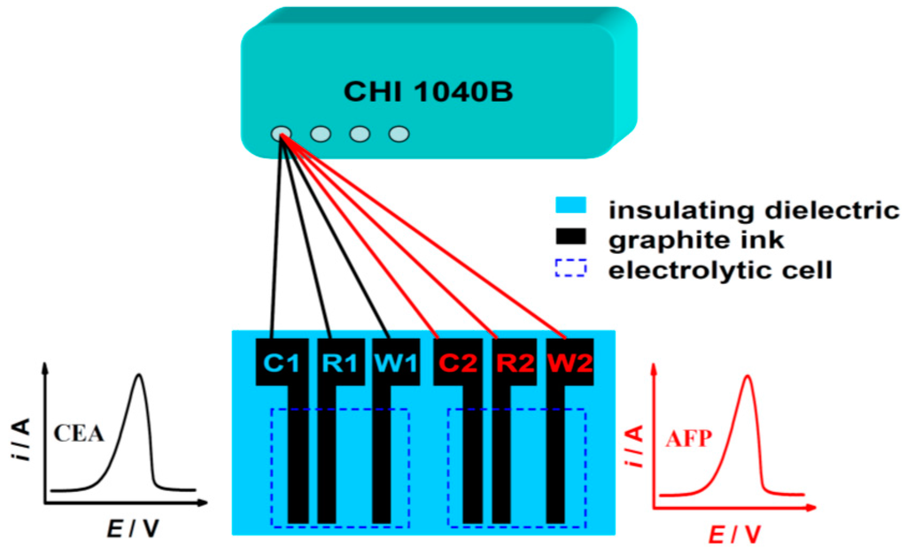 The two-analyte immunoassay using CdS QDs as biolabels was similarly conducted. The SPCEs containing two graphite WEs, two graphite quasi-references, and two graphite auxiliary electrodes were prepared by the aforementioned screen-printing equipment, as shown in Scheme 2. Two electrochemical microcells were constructed by the insulating layer printed around the working areas. The two-analyte immunoelectrodes using the working SPCEs were constructed similarly to those using GCEs as before.