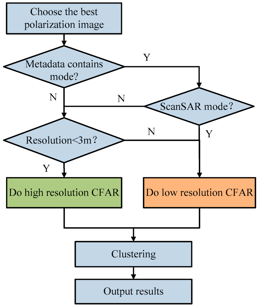 As the core objective of SAR sensors, the spatial resolution will determine which detection algorithm is applied. Since the current advanced SAR sensors (TerraSAR-X, COSMO SkyMed, etc.) usually provide a resolution higher than 3 m while early SAR sensors cannot, 3 m is considered as the threshold to distinguish high resolution and low resolution imagery in this paper. Two distinct CFAR strategies are applied to high resolution and low resolution SAR imagery respectively. The imaging mode also helps to determine the CFAR strategy.
