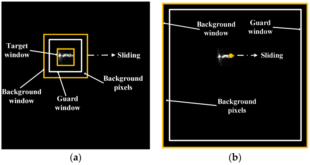 Comparison of sliding windows of low resolution CFAR (Constant False Alarm Rate) (a) and high resolution CFAR (b), the black block represents an image tile.
