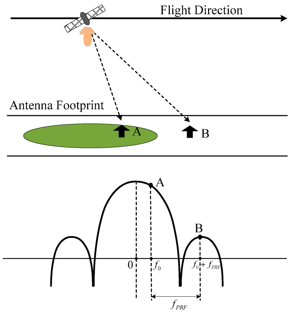 Illustration of azimuth formation in synthetic aperture radar (SAR) images (Points A and B have equal Doppler histories due to aliasing) [50].
