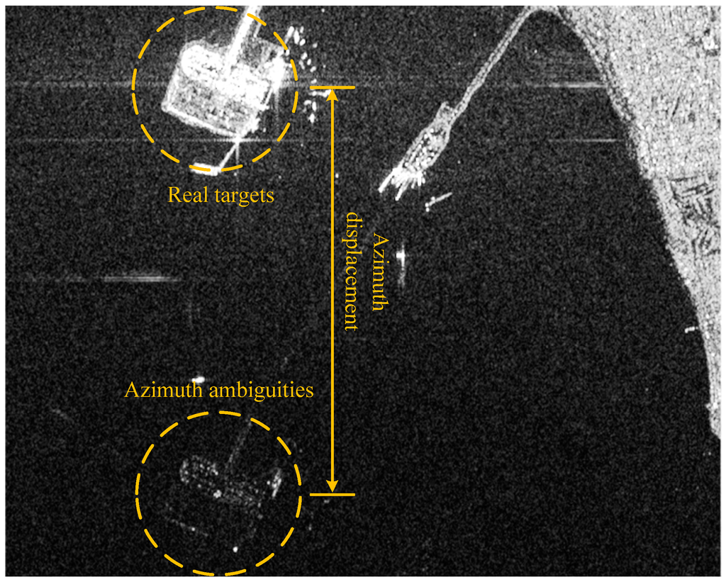 Azimuth ambiguities in SAR images are spatially displaced in azimuth directions at approximate locations [49,50],