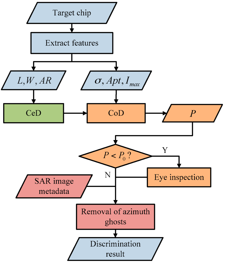 During CeD, some ship candidates are discarded as they are considered to be false alarms with high degree of certainty. However, the remaining detection results can still contain false alarms. Supervised learning methods such as QD (Quadratic Distance), SVM (Support Vector Machine), BNN (Bayesian Neural Network) and QPD (Quadratic Polynomial Distance) [43,44,45] usually include two steps: training and testing. However, they are not easy for ship discrimination because training and testing data can be collected under different background, by different sensors, in different weather conditions. The training requires enough representative data. However, it is not a tractable work usually.