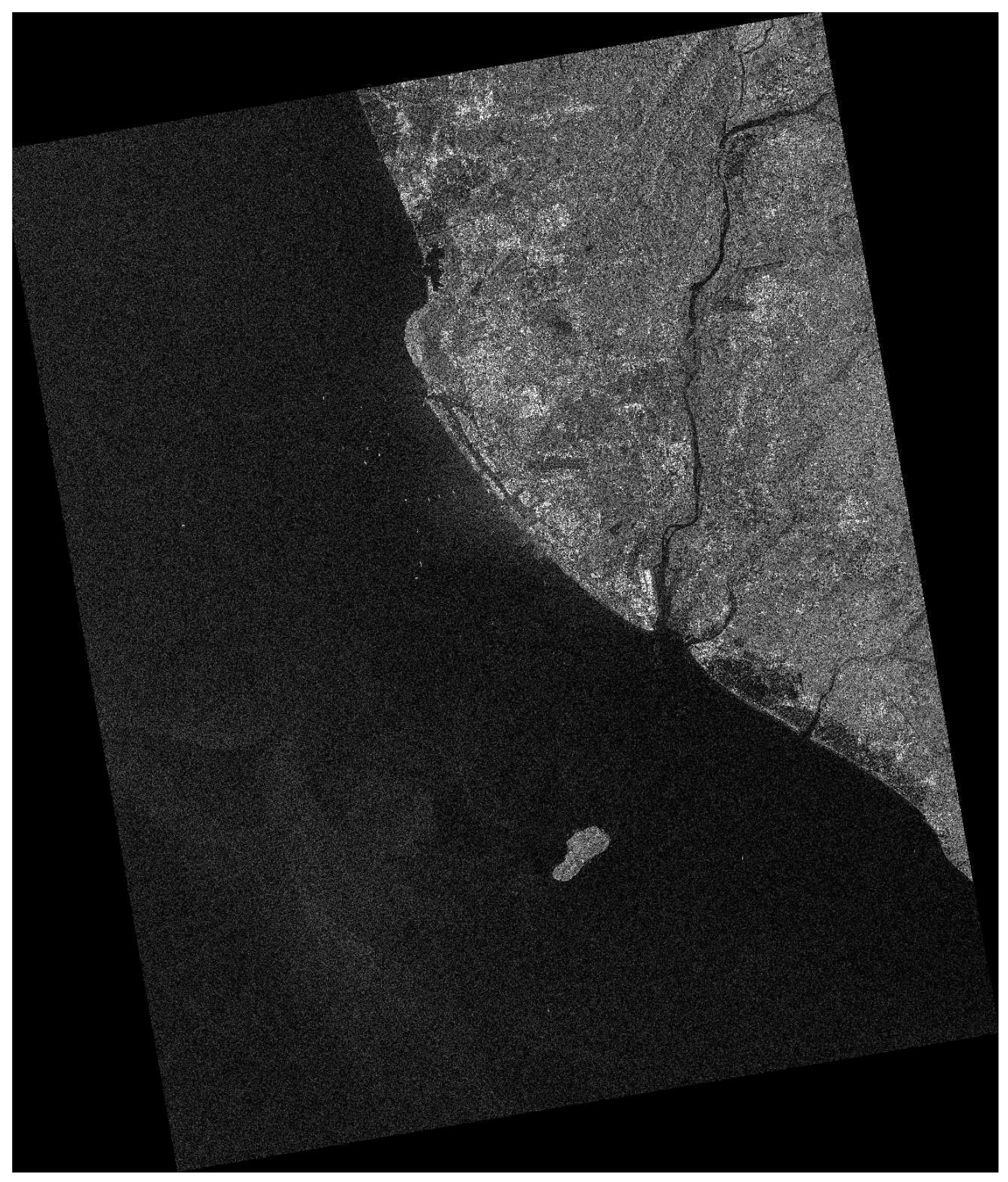Figure 9 shows the RADARSAT-1 image whose imaging area is Kaohsiung, Taiwan. Its imaging mode is FINE, polarization channel is HH, size is 8758 × 10,472, spatial resolution is 8 m, and pixel size is 6.25 m. The incidence angle varies from 37° to 48°. Here only the HH channel image is provided. Its clutter level is low and azimuth ambiguities can occur easily. The island and rivers in this image can influence land masking. The downsampling rate .