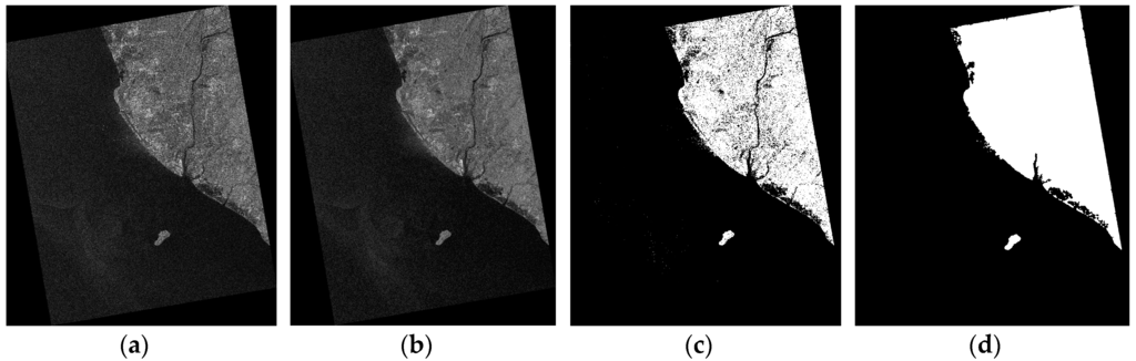 In this step, we apply a distinction between land and water. Generally, the radar returns from land are expected to be higher than water. As a result, pixel values of land are higher than water. Otsu method [31] is employed to segment the image. The land mask value is calculated as follows,
