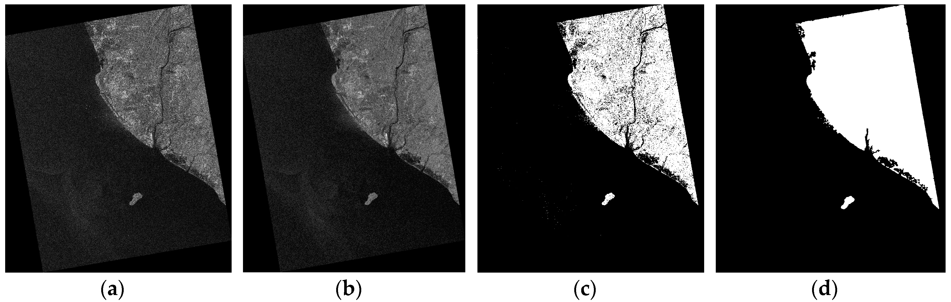 - Baselice, F.; Ferraioli, G. Unsupervised coastal line extraction from SAR images. IEEE Geosci. Remote Sens. Lett. 2013, 10, 1350–1354. [Google Scholar] [CrossRef]