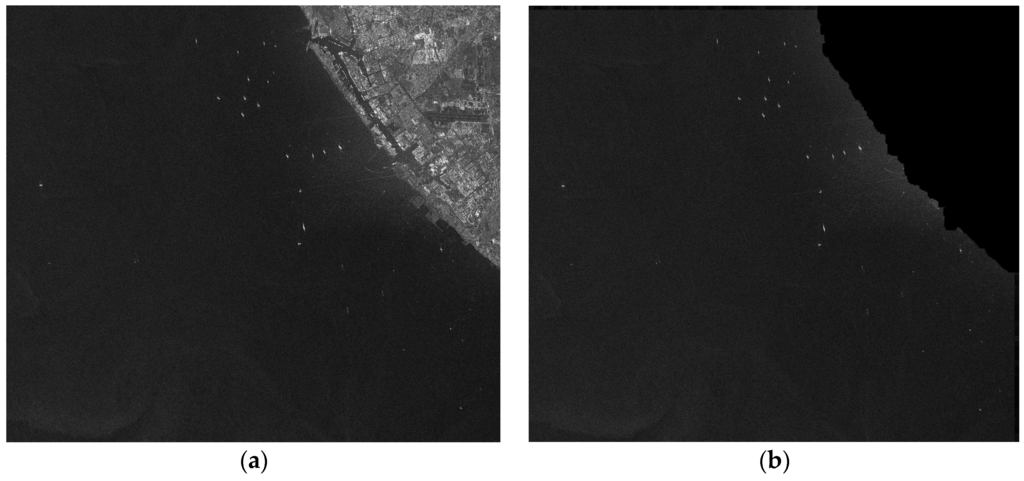 In this step, the land mask is mapped to the original SAR images. Land areas are marked as 1 (white), and the water is marked as 0 (black).