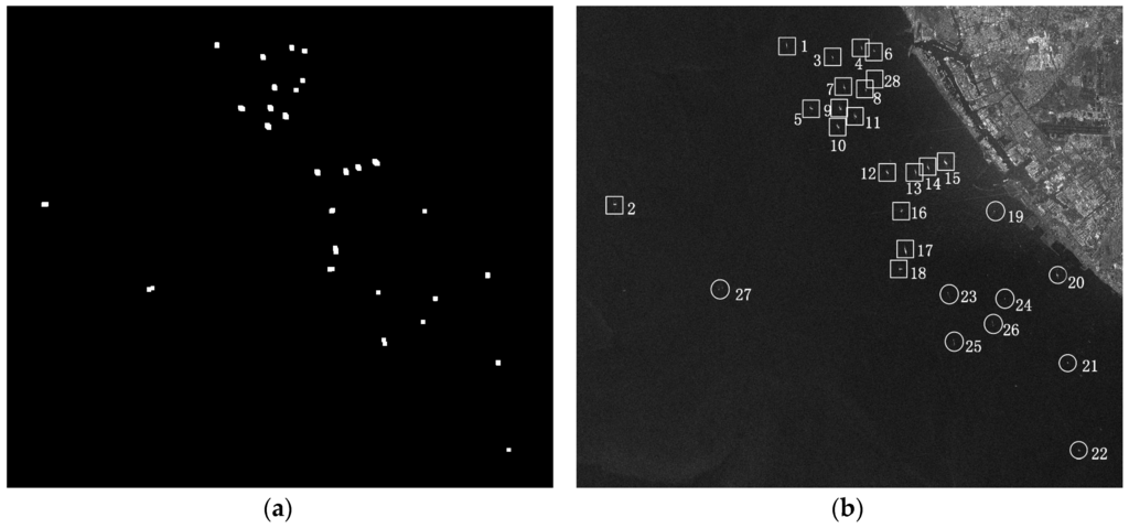 Empirically, the length of ship targets is no longer than 300 m in most cases (Certain ships can be longer than 300 m, e.g., aircraft carriers, and this threshold can be adjusted according to users’ need), and the width is no longer than 60 m. However, both the measured length and width are usually larger than the real value because of sidelobes. Smearing or defocusing caused by the movement of ships also enlarges the length or width. Thus, the upper limit of or are set larger, 360 m and 80 m, respectively. If or is beyond the range, it may be not a ship. At the same time, because of designed requirements, the aspect ratio of ships is less than 10. As and are enlarged, the aspect ratio of ship targets in SAR images is usually smaller. We set the threshold of aspect ratio as 9 in this paper. If aspect ratio is larger than 9, the target is not considered to be a ship.