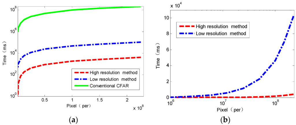 Time consumption of our methods is on the order of seconds. Compared with conventional CFAR methods (K-distribution based, CFAR windows slide with a step of one pixel) whose work lasts tens of minutes or more than one hour, the proposed method can finish in a real time fashion when applied to large size images. Conventional CFAR here means that we apply the same CFAR (same distribution mainly) over each pixel of the image without using our method, particularly its CFAR window setting is different. The biggest time-saver is the frame proposed in Section 2.2. In order to evaluate the time consumption in a more detailed manner, we derive the results of experiments on images whose size ranges from 1000 × 1000 to 15,000 × 15,000. Figure 13 presents the comparison of time consumption between the proposed method and conventional CFAR. It is obvious that the proposed method (High or low resolution CFAR) is much more economic than the conventional CFAR method in time consumption. For an image of 200 million pixels (a popular size of spaceborne SAR image), conventional CFAR costs about 60 h, low resolution method fewer than 2 min and high resolution method about 4 s. Thus, the proposed method can be completed in seconds for most SAR imagery.