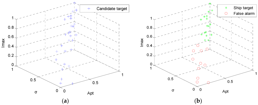 In this section, CoD method is applied to the 28 candidates. The three features are normalized into interval [0, 1] firstly. Figure 14a shows the feature space. Each blue + represents a candidate target. These candidate targets are clustered into 2 clusters by K-means discrimination method. The preliminary discrimination results are shown in Figure 14b. Green * near represents ship target and red ○ near false alarm.