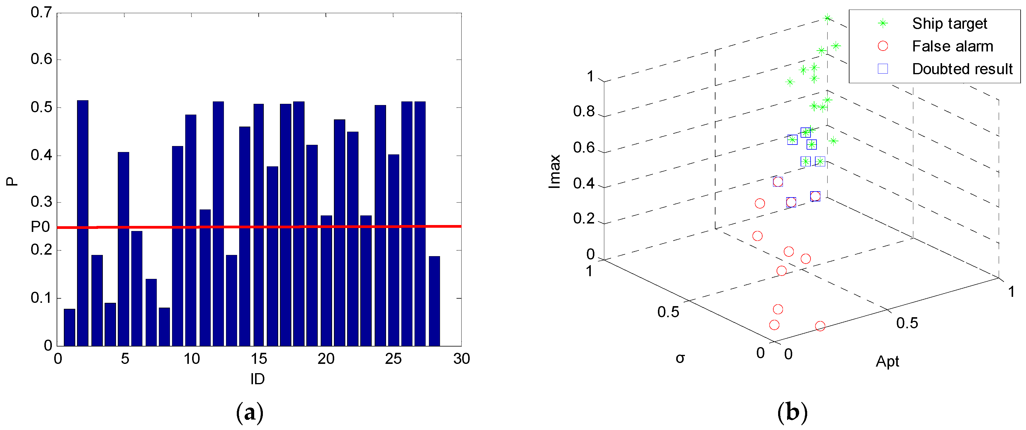 As shown in Table 6, CoD method returns 11 false alarms and 17 ship targets in total. √ represents ship target and × represents false alarms. We calculate the confidence probability of each discrimination result via the Formula (6). Figure 15a provides a bar graph to illustrate confidence probability more briefly. We set the threshold = 0.25 in this paper (It can be adjusted according to users’ need). It is clear that there are 20 discrimination results whose confidence probabilities are higher than . They are considered to be correct. On the other hand, there are 8 discrimination results whose confidence probabilities are lower than . They are considered to be doubtful and need to be discriminated further. These 8 results are 1st, 3rd, 4th, 6th, 7th, 8th, 13th, and 28th. They are marked with blue □ in Figure 15b. As shown in Figure 15b, they are so close to each other that they can get wrong.