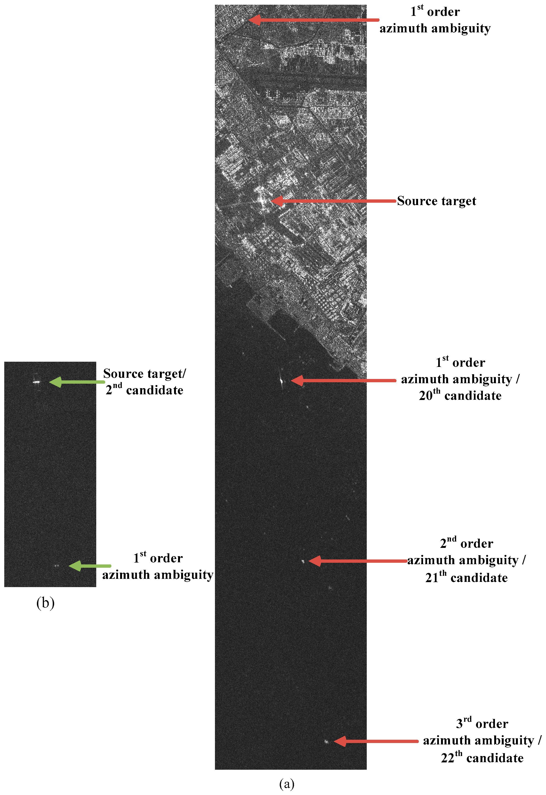 Attention should be paid to that the source target on the land generates the 2nd azimuth ambiguity (21st candidate target) and 3rd azimuth ambiguity (22nd candidate target) as shown in Figure 17a. The 2nd candidate target also forms 1st order azimuth ambiguity. However, they are all cascaded by CFAR or CoD as their low contrast. The 20th candidate target, however, is very similar to a real ship target either in contrast features or shape and size features. Discrimination methods based on features cannot distinguish it any more. It also confuses human eyes if the prior information is not given. Thus, the removal of azimuth ambiguities is an essential problem that should be considered.