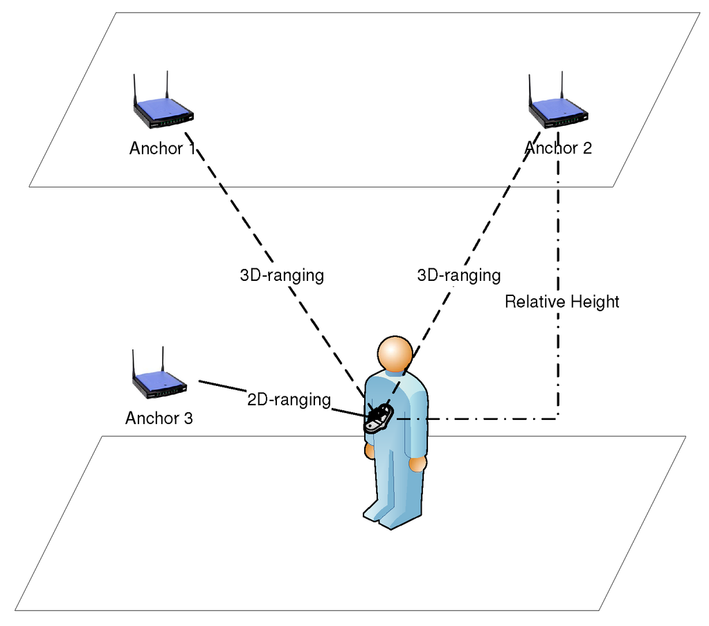 where denotes the distance function from anchor j to the target. If the relative height between the anchor and target is not zero, which is always applicable in the real case, the measurement depends on 3D coordinates, then we define the range measurement as 3D-ranging. The 3D-ranging for each anchor is formulated as: