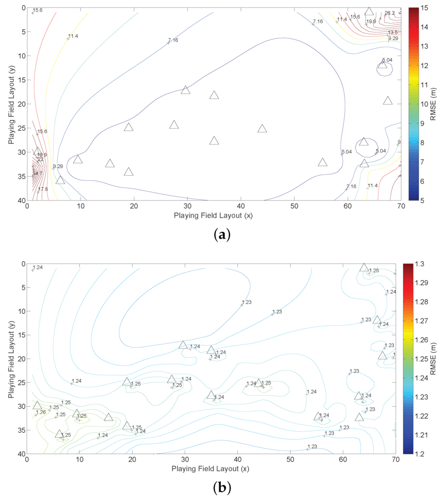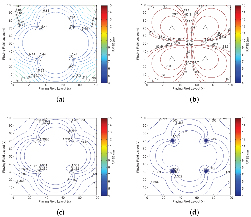 We apply the CRLB to indicate the optimal squared error, which is . To illustrate the target-anchor geometry effect for the 2D localization system in the playing field, we employ to depict the spatial position error distribution (SPED) [28]. The SPED is defined as the distribution of the position error for every possible target position, which estimates the positions point by point in the whole playing field and draws statistical results. Thus, every position in the playing field is assumed as the target position during the simulation. The SPED is derived according to all of the statistical results of the estimation error of all of the positions in the playing field. It illustrates how the performance changes according to the target-anchor (RX-TX) geometry effect. When the anchor positions and the error model change, the SPED changes accordingly, which helps to understand the relationship between the anchor deployment and the algorithm. The SPED results are represented by the contours in Figure 2, where the four anchor positions are marked by triangles.