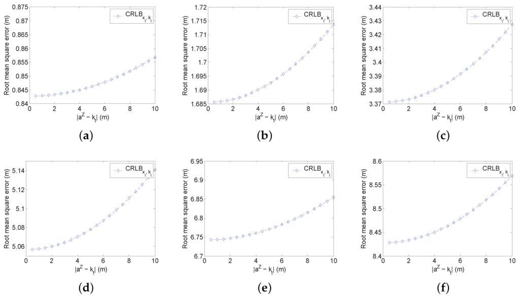 Then, the prior information of , and is used in the CRLB to improve the estimation accuracy. The SPEDs with prior information are depicted in Figure 2c,d. When the prior state information of is introduced in Figure 2c, the estimation error is reduced effectively from more than 5 m in Figure 2a to 1.4 m below. In addition, the position error is almost the same everywhere, although the geometric pattern is similar to Figure 2a, which indicates that the geometric impact is reduced by using the prior information of . In Figure 2d, we assume that all of the prior information is available, then the estimation error is reduced to below 1.4 m, just as Figure 2c. Although Figure 2d still has a geometric pattern, which is similar to Figure 2c, the errors in different positions are almost the same. Thus, the geometric effect is actually reduced. In addition, since the estimation error is not further reduced, the results in Figure 2d can be the limits based on the prior information. It is also demonstrated that the prior information of significantly reduces the estimation error and is the most important prior information especially in the recursive estimation. For the other two parts of the prior information, they are used for the improvement of the impacts of the relative height and the NLOS effects.