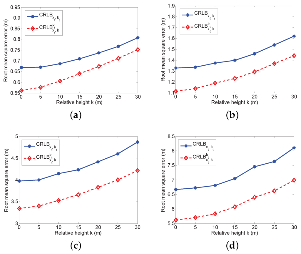 In addition, we evaluate the impact of the prior knowledge of in the multiple noise environment. The simulation results are presented in Figure 4. It is clearly observed that the prior knowledge can significantly improve the RMSE. If , the prior information of can even reduce 1 m RMSE. Additionally, if the error is small, the improvement is only a little bit. However, with the increased value of the relative height, the RMSE rises accordingly even with the prior information. For the real application, the relative height can be within 10 m, in which the improvement can effectively reduce the RMSE to a reasonable range. Therefore, even if the impact of the relative height is limited, it is still necessary to employ the prior information.