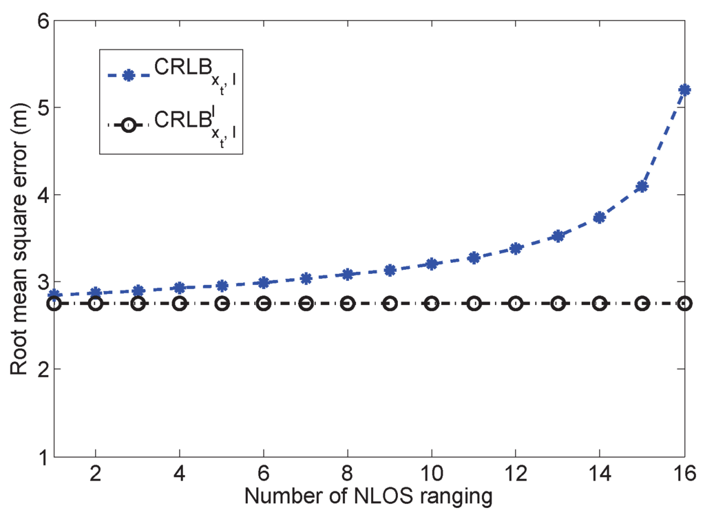where is the identity matrix of order , and the rest is a zero matrix due to the independent condition for the LOS measurement. As mentioned before, the zero matrix is mitigated during the calculation, then . Note that indicates the sub-matrix of the FIM, which means that the NLOS condition is unknown to the system. Then, the system should also estimate the NLOS parameters together with the position state in the real environment. In this case, the estimated error is propagated and degrades the position estimation.