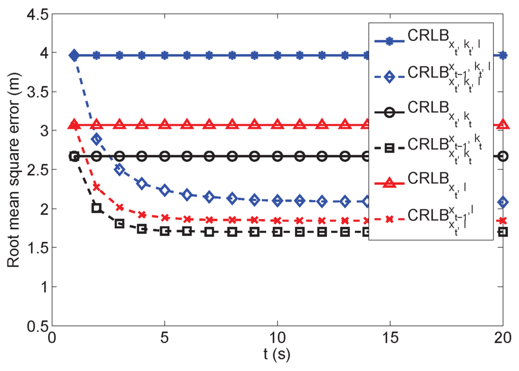 In this simulation, we evaluate the performance of the recursive Bayesian estimation for target tracking. Since the impacts of and are extensively analyzed above, this section mainly focuses on analyzing the impact of . The playing field is still , and 16 anchors are deployed randomly in the field. We evaluate the CRLB in three scenarios: The first one considers NLOS and relative height measurement; the second scenario considers only the relative height; the third scenario only has NLOS measurement. In each scenario, both CRLB without prior information and the recursive CRLB with prior information based on (27) are analyzed. Therefore, we evaluate and in the first scenario, and in the second scenario and and in the third scenario. We assume that the prior information is unknown initially in the recursive estimation. This information can only be obtained recursively after the initial estimation is obtained. Then, the recursive estimation is applied.