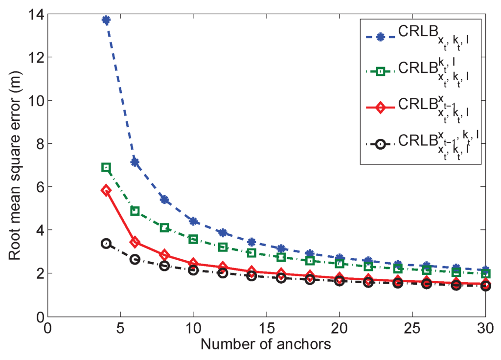The relationship between the CRLB and the number of anchors is illustrated in Figure 8. We randomly deploy multiple anchors in the playing field. The number of anchors is adapted from four to 30. Both and are considered in this simulation. We assume that all of the measurements are NLOS. In this simulation, we evaluate , , and . With a few anchors, contains large error, which achieves more than 15 m. When the number of anchors is four, the prior information of and can reduce much of the error as indicated by the curve of . Furthermore, the recursive estimation based on can reduce much of the error, which is even smaller than . The error of the recursive estimation based on is only a little lower than . It is demonstrated that compared to the prior information of and , is the dominant factor for reducing the estimation error. However, when the number of anchors is increased, all of the curves converge gradually to a low value. In this case, the prior information does not improve much for the estimation. Thus, even if the prior information is not available, using more observations still improves the estimation accuracy effectively.