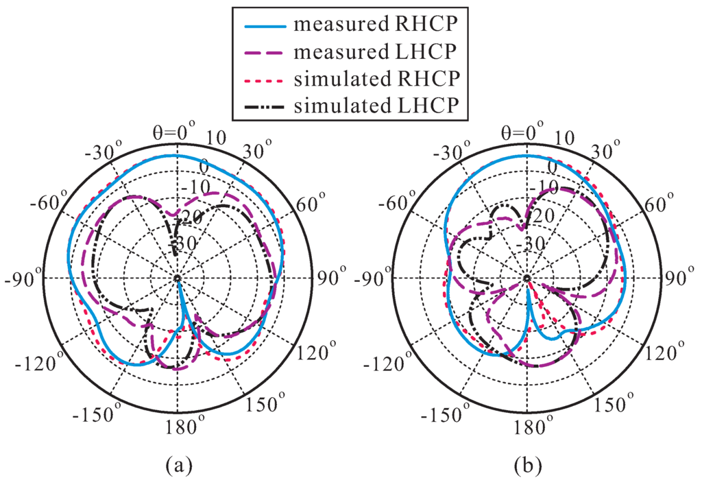 Figure 7 depicts the measured and simulated radiation patterns of the proposed antenna on the xz- (ϕ = 0°) and yz- (ϕ = 90°) planes at 3.1 GHz. It was noted that left-handed circular polarization (LHCP) gain is 18.5 dB less than the RHCP gain in the broadside direction.