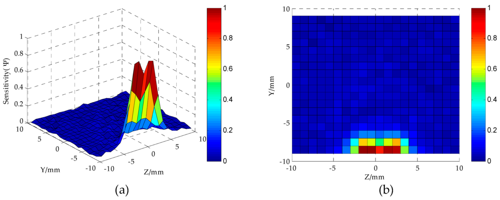 Based on the study of the sensor electric field using FEM, we can further calculate the 2D sensitivity distribution between two measuring electrodes of the MCP. In the calculation, the relative resistivity of water and oil are respectively set as 100 Ω·m and 1.0E + 13 Ω·m. It is worth nothing that the center of mass of the oil droplet is located on the YoZ plane section. The total number of the test positions N is equal to 399.