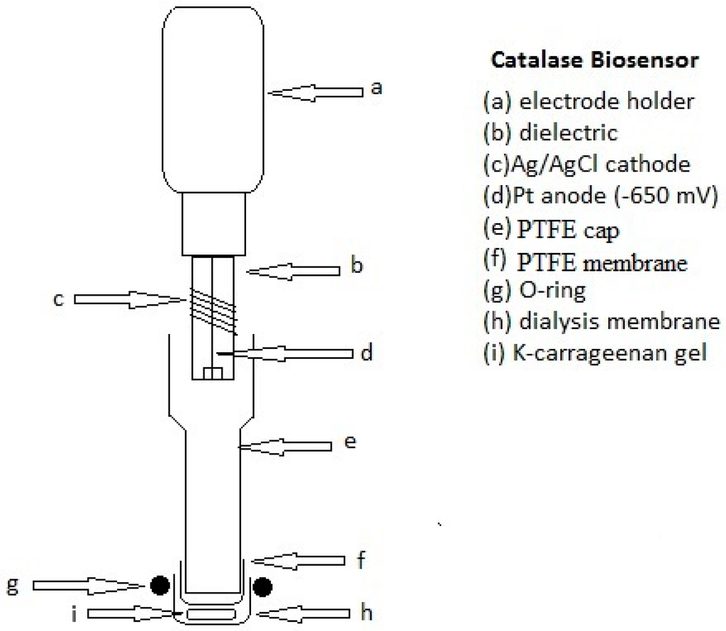 A kappa-carrageenan disk containing the immobilized enzyme was placed at the PTFE electrode tip, sandwiched between a gas-permeable (PTFE) membrane and a dialysis membrane (Figure 1).